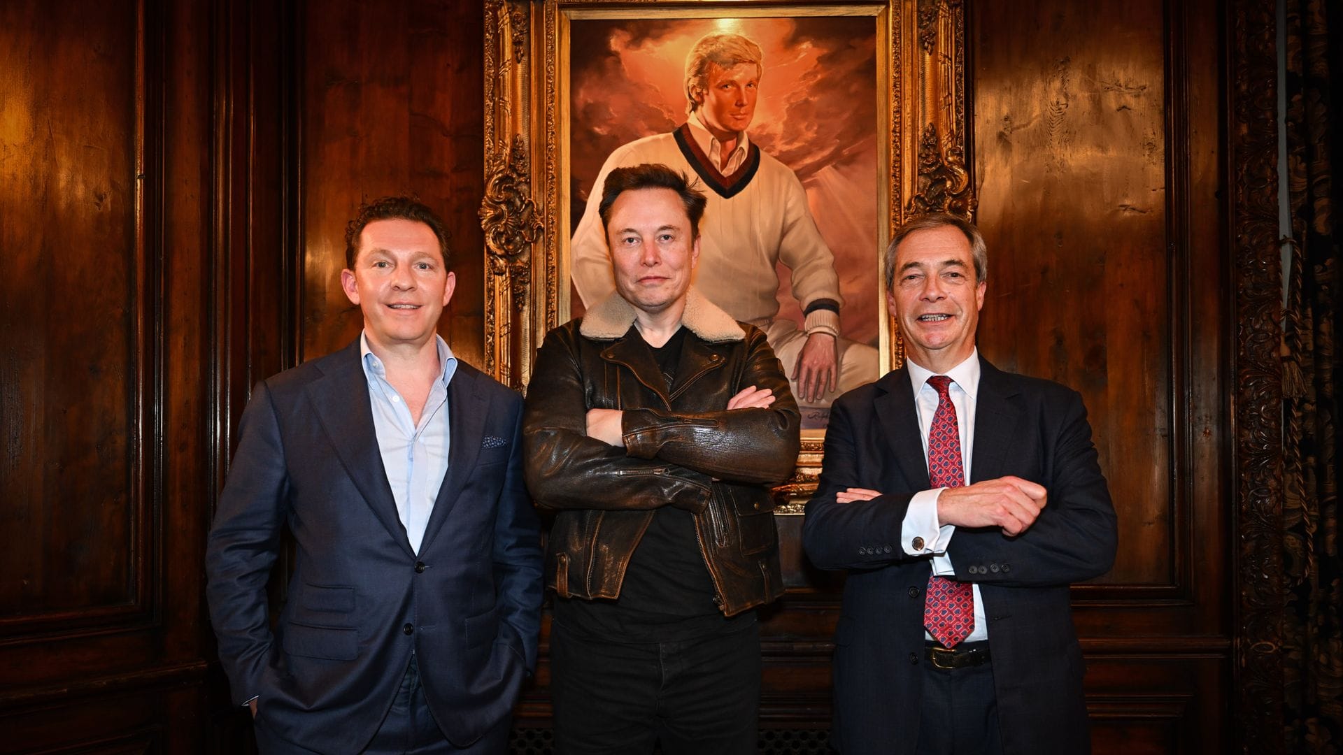 From left to right, we have the following personages: Nick Candy, Elon Musk, and Nigel Farage. In the background, behind the three men is a portrait painting of a young(er) Donald Trump. The painting is titled The Visionary, and it was created in 1989.